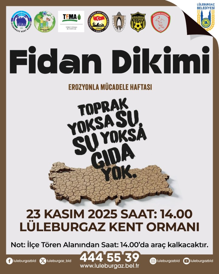 Erozyonla Mücadele Haftası çerçevesinde 23 Kasım Pazar günü saat 14.00'da Kent Ormanı'nda gerçekleştirilecek olan fidan dikimi etkinliğine tüm halkımız davetlidir. İlçe Tören Alanı'ndan saat 14.00'da ücretsiz araç kalkışı olacaktır.