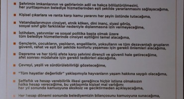 “Atatürk devrimlerine, Cumhuriyetimizin kuruluş değerlerine ve evrensel insan hakları ilkelerine bağlı kalacağıma, Hukukun üstünlüğünü ve Anayasayı daima savunacağıma, Çalışkan, dürüst ve adil olacağıma, Liyakatten taviz vermeyeceğime, siyasi ayrımcılık veya kayırmacılık yapmaksızın halkın yanında, halkla iç içe çalışacağıma, Şehrimin imkanlarının ve gelirlerinin adil ve hakça bölüştürülmesini, her yurttaşımızın belediye hizmetlerinden eşit şekilde yararlanmasını sağlayacağıma, Kişisel çıkarlara ve ranta karşı kamu yararını her şeyin üstünde tutacağıma, Vatandaşlarımızın cinsiyet, etnik köken, dini inanç, siyasi görüş, sosyal sınıf gibi farklılıklar nedeniyle dışlanmasına izin vermeyeceğime, İstihdam, yatırımlar ve sosyal politika başta olmak üzere tüm belediye hizmetlerinde cinsiyet eşitliğini temel alacağıma, Gençlerin, çocukların, yaşlıların, engellilerin, yoksulların ve tüm dezavantajlı grupların güvenli, rahat ve eşit bir şekilde konforlu yaşaması için gerekli önlemleri alacağıma, Çevreyi, yeşili ve sürdürebilirliği gözeteceğime, Tüm hayatlar değerlidir yaklaşımıyla hayvanların yaşam hakkına saygılı olacağıma, Şeffaflık ve hesap verebilirlik ilkesi gereğince hiçbir istisna olmaksızın halka hesap vereceğime, bu yaklaşımla kişisel mal varlığımı her yıl sonunda kamuoyuna eksiksiz ve geciktirmeden açıklayacağıma, Her hesap dönemi sonunda belediyemizin bilançosunu kamuoyuna sunacağıma, Halkçı belediyeciliği yönetim anlayışımın merkezine koyacağıma, Mazeret üretmek yerine her koşulda çözüm ve maharet üreteceğime söz veriyorum”