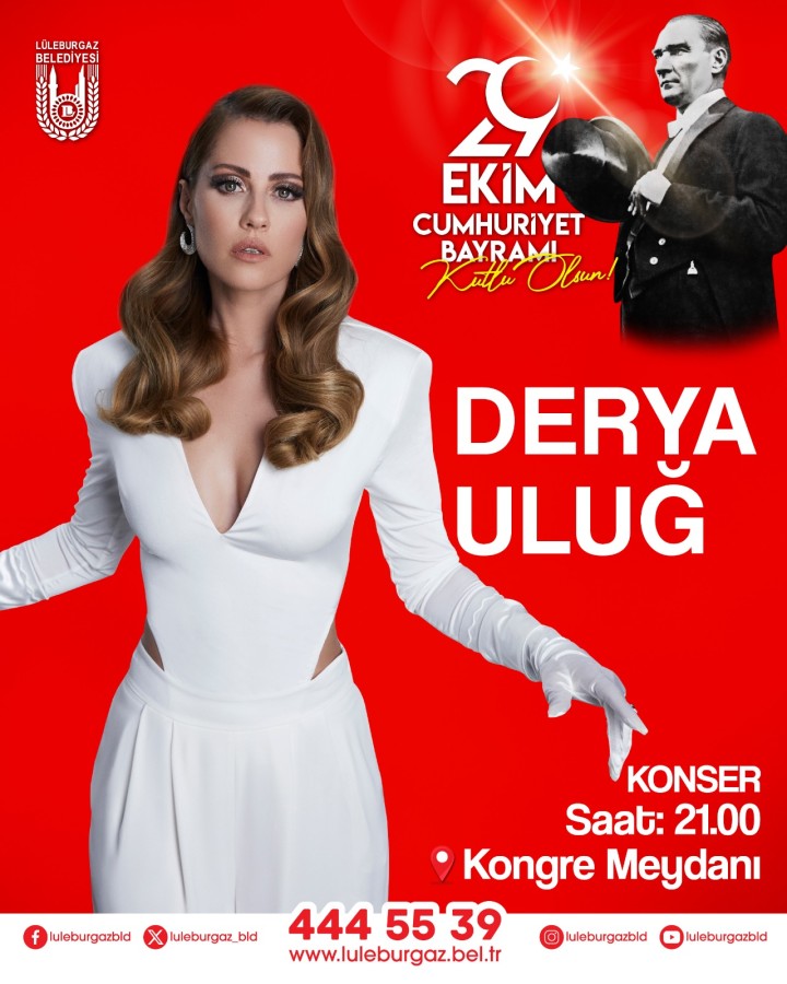 Lüleburgaz Belediyesi’nin Cumhuriyetin 102’nci yılı kutlamaları kapsamında ünlü şarkıcı Derya Uluğ Kongre Meydanı’nda sahne alacak.