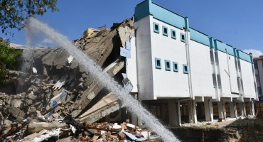 İtfaiye ekipleri de toz oluşumunu engellemek amacıyla yıkım bölgesine su sıktı.