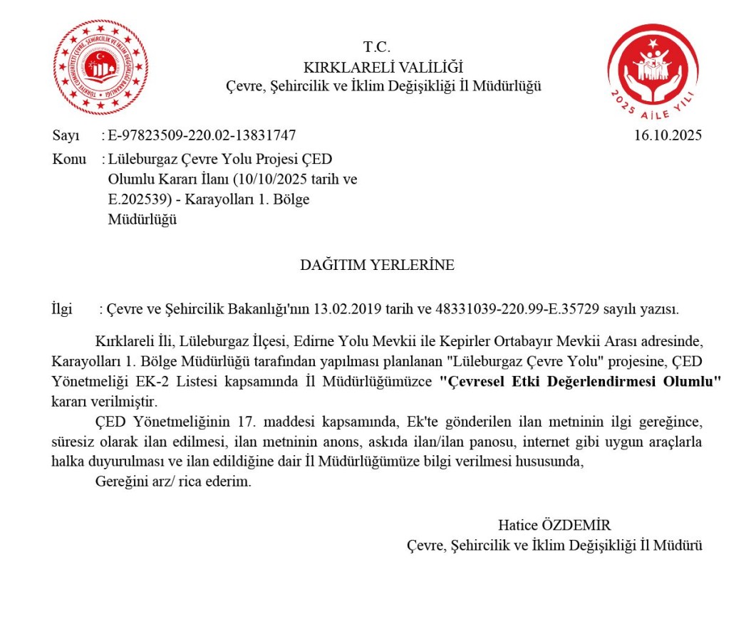 Söz konusu kararda; “Kırklareli İli, Lüleburgaz İlçesi, Edirne Yolu Mevkii ile Kepirler Ortabayır Mevkii Arası adresinde Karayolları 1. Bölge Müdürlüğü tarafından yapılması planlanan "Lüleburgaz Çevre Yolu" projesine İl Müdürlüğümüzce “Çevresel Etki Değerlendirmesi Olumlu Kararı” verilmiştir” denildi.