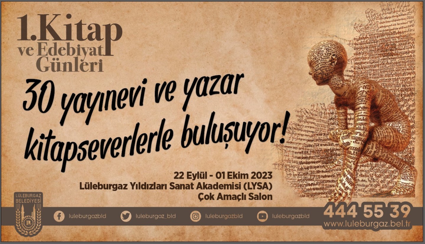 Lüleburgaz son yılların en önemli kültür-sanat etkinliklerinden birine hazırlanıyor. Lüleburgaz Belediyesi’nce 22 Eylül-1 Ekim tarihleri arasında düzenlenecek 1. Kitap ve Edebiyat Günleri’ne Onur Konuğu olarak şair ve yazar Şükrü Erbaş katılacak, Türk edebiyatının son dönemdeki en popüler ‘polisiye roman’ yazarlarından Ahmet Ümit başta olmak üzere 30 yayınevi ve yazar kitaplarını imzalayacak. 1. Kitap ve Edebiyat Günleri’nin resmi açılışı 22 Eylül’de saat 16:00’da yapılacak.