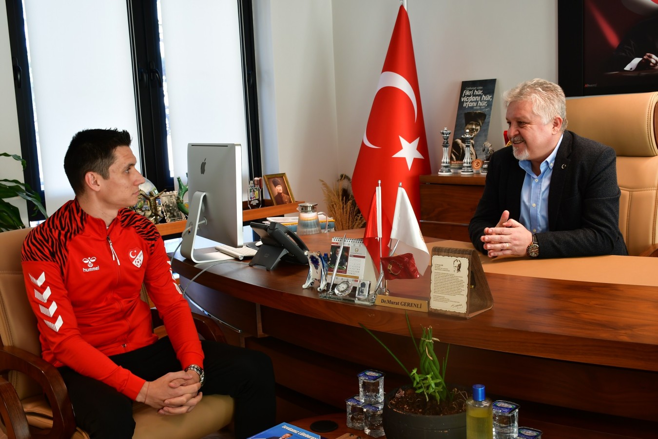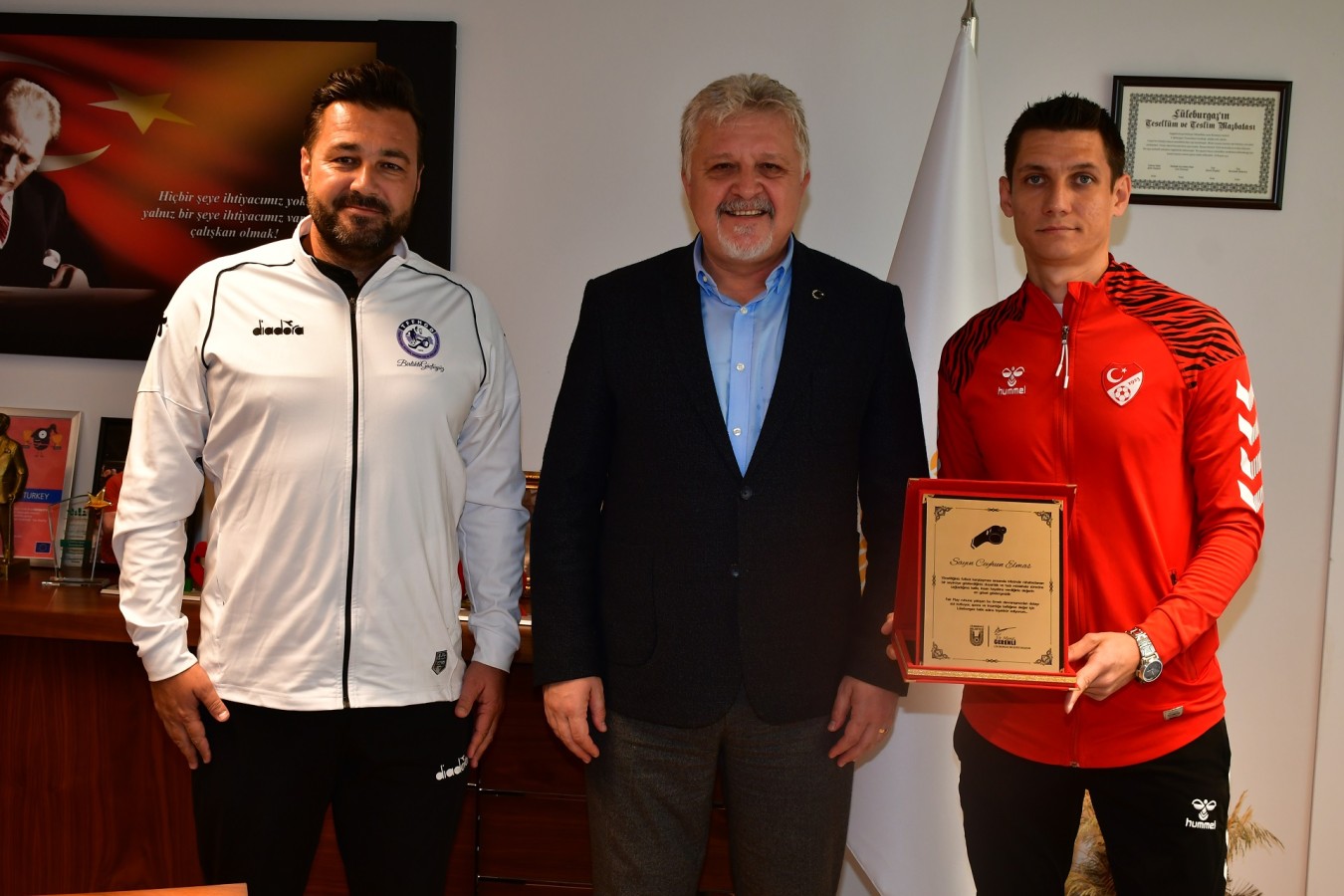 Verdiği kararla rahatsızlık geçiren bir taraftara erken müdahale yapılmasını sağlayarak tüm Türkiye’ye örnek olan hakem Ceyhun Elmas ve Türkiye Faal Futbol Hakemleri ve Gözlemcileri Derneği Kırklareli Şube Başkanı Oktay Erden, Lüleburgaz Belediye Başkanı Dr. Murat Gerenli’yi ziyaret etti.